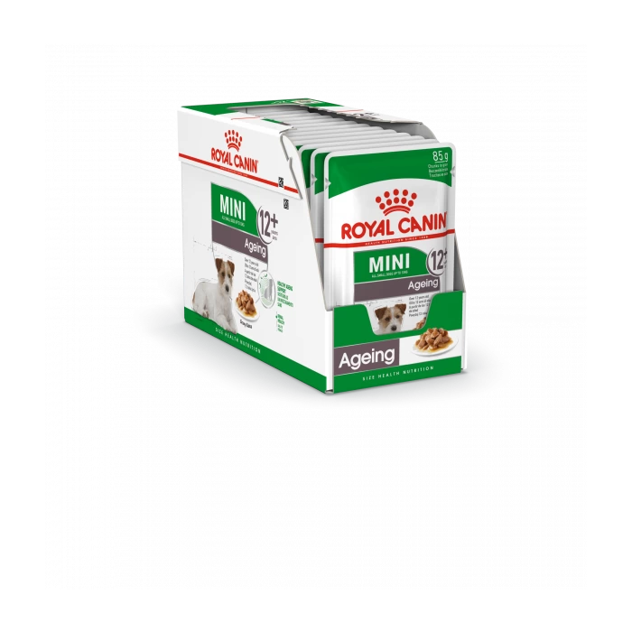 ROYAL CANIN® Mini Ageing 12+ in Gravy (en sauce) est spĂ©cialement formulĂ© pour rĂ©pondre Ă tous les besoins nutritionnels de votre petit chien et convient aux chiens de petite taille de plus de 12 ans. pesant jusqu’Ă 10 kg.